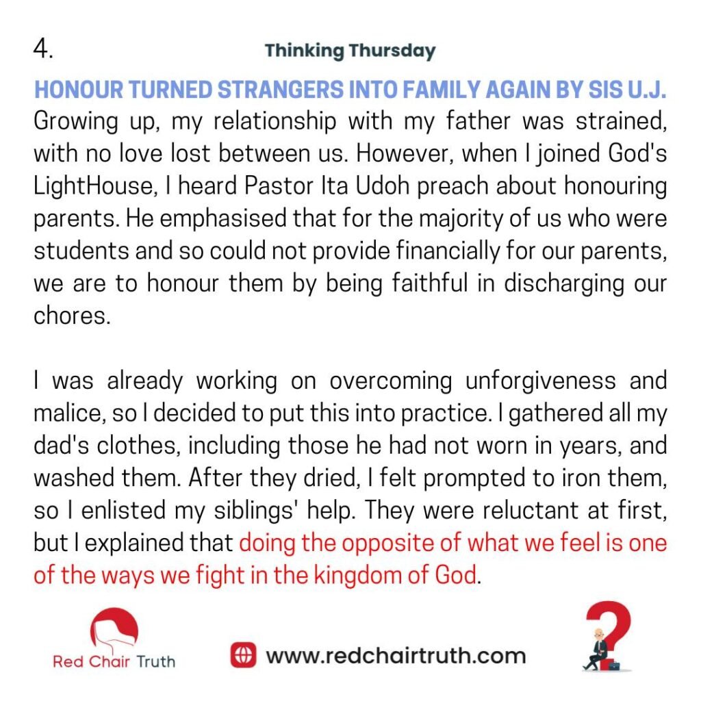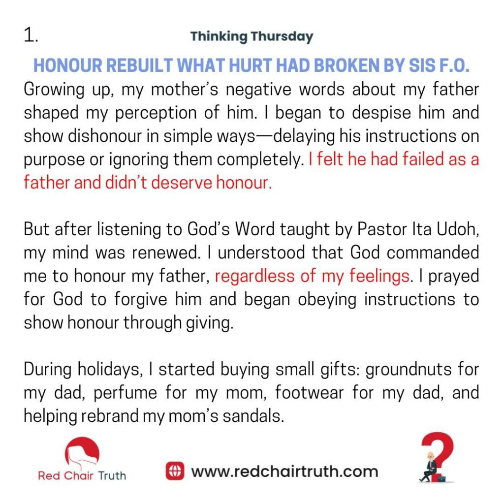 But after listening to God’s Word taught by Pastor Ita Udoh, my mind was renewed. I understood that God commanded me to honour my father, regardless of my feelings. I prayed for God to forgive him and began obeying instructions to show honour through giving.