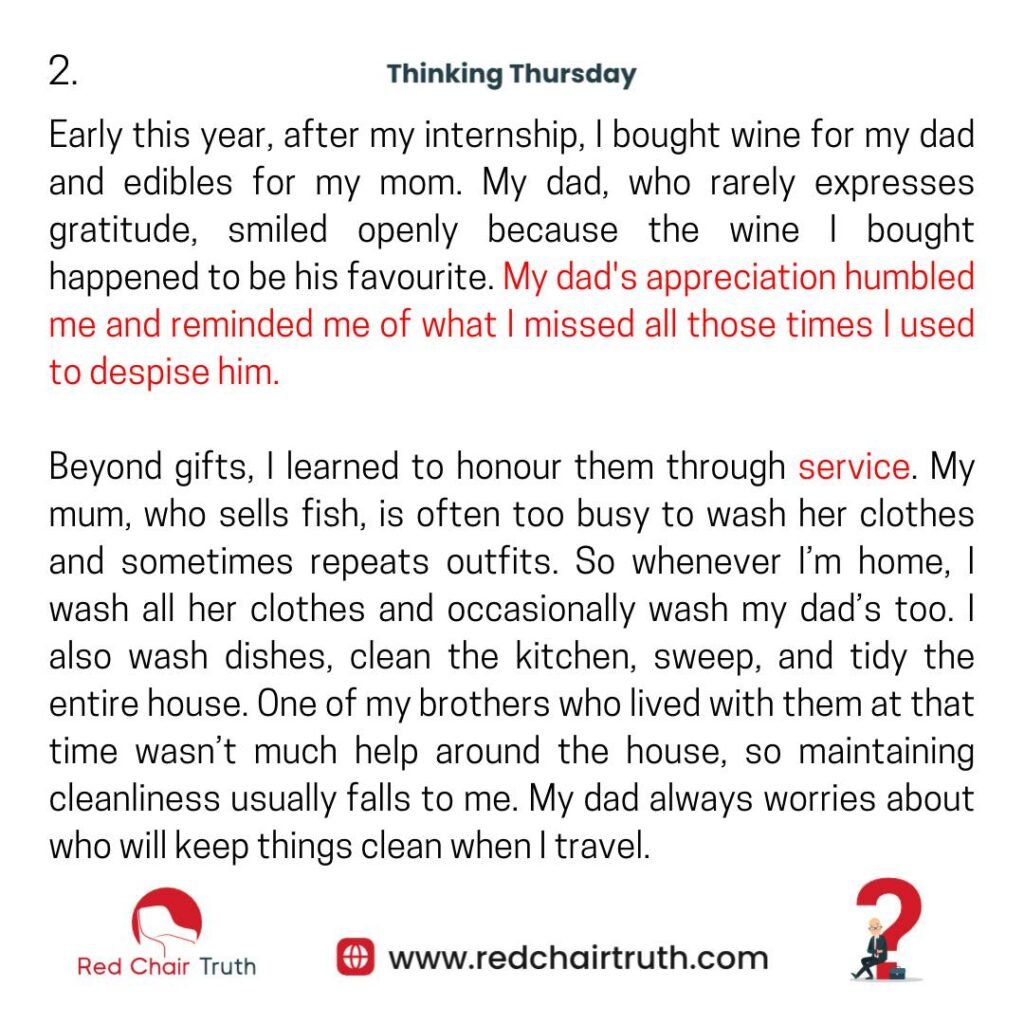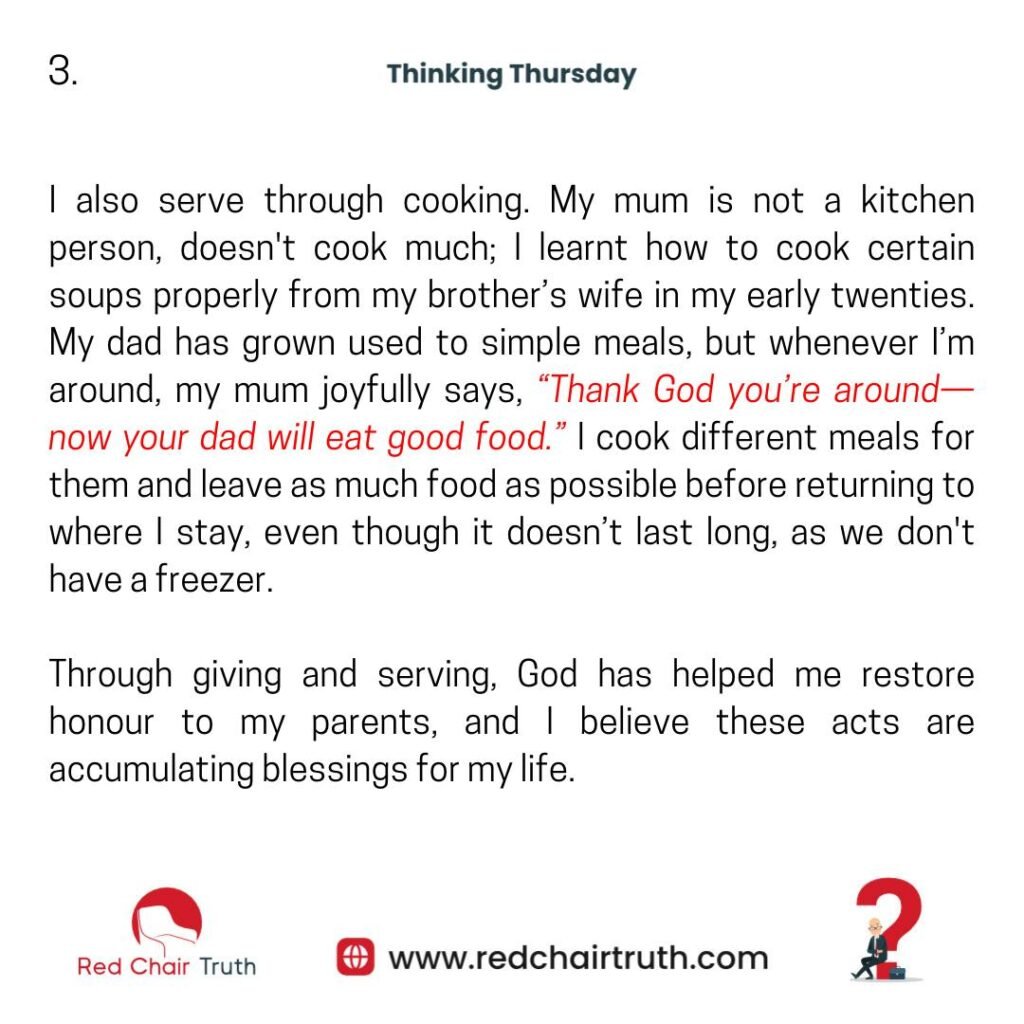 Beyond gifts, I learned to honour them through service. My mum, who sells fish, is often too busy to wash her clothes and sometimes repeats outfits. So whenever I’m home, I wash all her clothes and occasionally wash my dad’s too. I also wash dishes, clean the kitchen, sweep, and tidy the entire house. One of my brothers who lived with them at that time wasn’t much help around the house, so maintaining cleanliness usually falls to me. My dad always worries about who will keep things clean when I travel.
