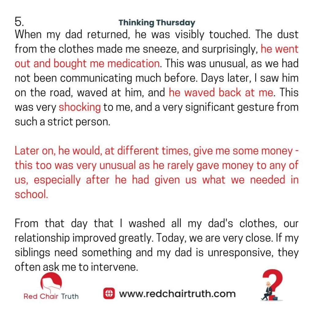 From that day that I washed all my dad’s clothes, our relationship improved greatly. Today, we are very close. If my siblings need something and my dad is unresponsive, they often ask me to intervene.