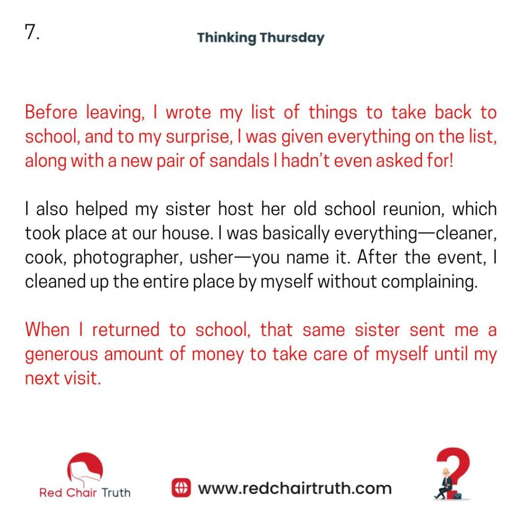 When I returned to school, that same sister sent me a generous amount of money to take care of myself until my next visit.