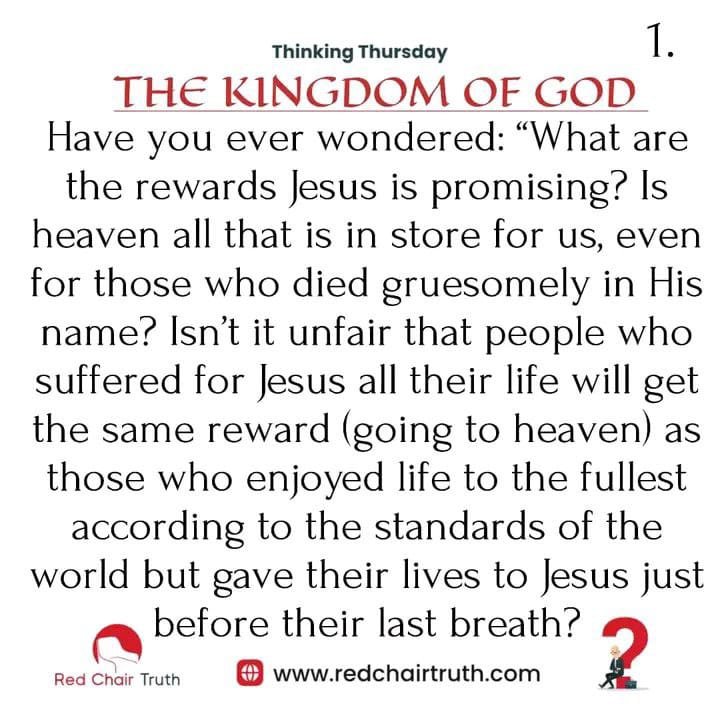 Have you ever wondered: “What are the rewards Jesus is promising? Is heaven all that is in store for us, even for those who died gruesomely in His name? Isn’t it unfair that people who suffered for Jesus all their life will get the same reward (going to heaven) as those who enjoyed life to the fullest according to the standards of the world but gave their lives to Jesus just before their last breath?