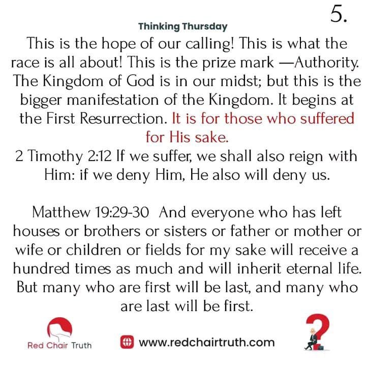 This is the hope of our calling! It is what the race is all about! This is the prize mark – Authority The Kingdom of God is in our midst, but this is the bigger manifestation of the Kingdom. It begins at the First Resurrection. It is for those who suffered for His sake.
