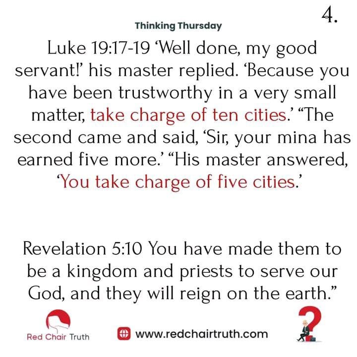 Luke 19:17-19 ‘Well done, my good servant!’ his master replied. “Because you have been trustworthy in a very small matter, take charge of ten cities. “The second came and said, ‘Sir, your mina has earned five more. “His master answered. ‘You take charge of five cities.’