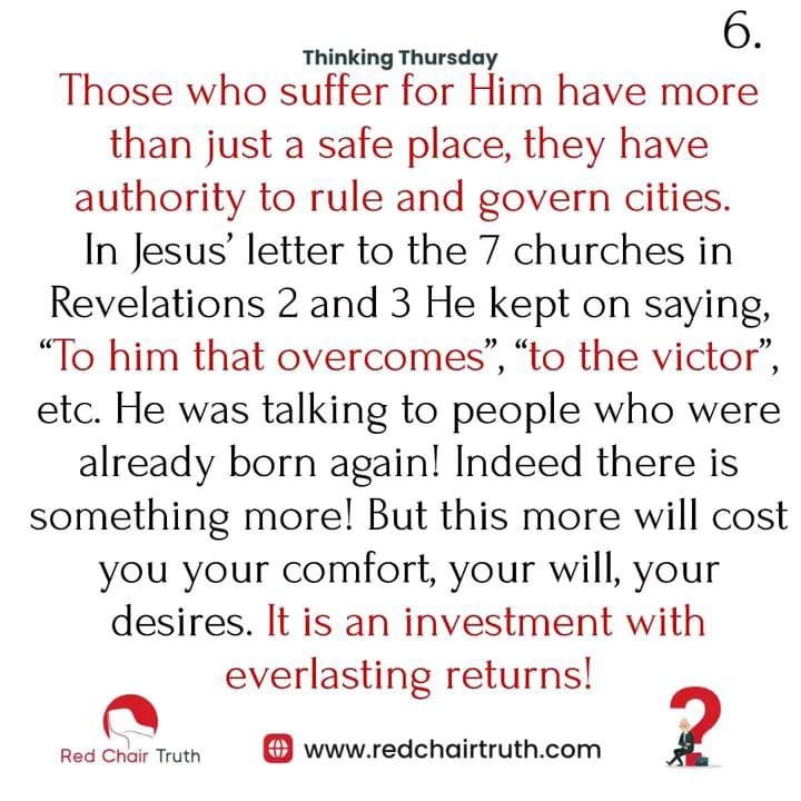 Those who suffer for Him have more than just a safe place, they have authority to rule and govern cities. In Jesus’ letter to the 7 churches in Revelations 2 and 3 He kept on saying, “To him that overcomes”, “to the victor”, etc. He was talking to people who were already born again! Indeed there is something more! But this more will cost you your comfort, your will, your desires. It is an investment with everlasting returns!