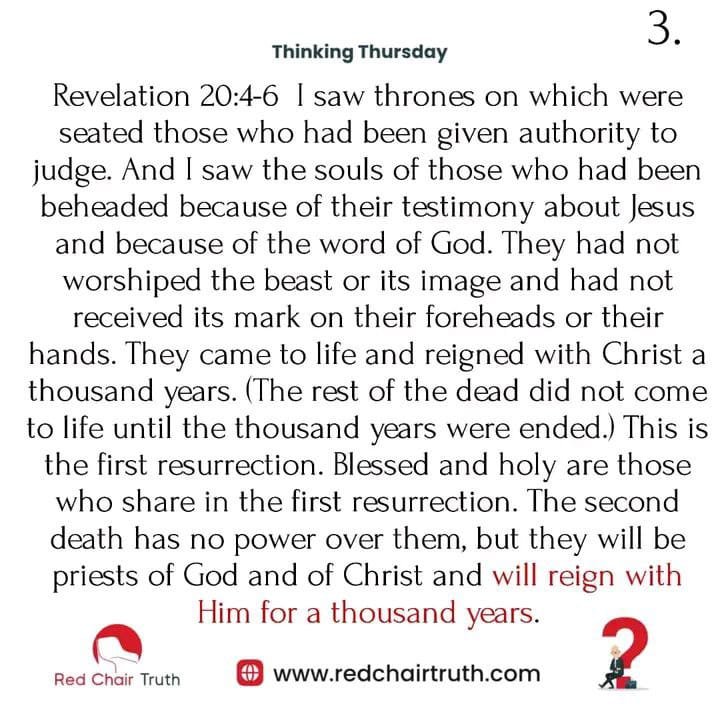 Revelation 20:4-6 I saw thrones on which were seated those who had been given authority to judge. And I saw the souls of those who had been beheaded because of their testimony about Jesus and because of the word of God. They had not worshiped the beast or its image and had not received its mark on their foreheads or their hands. They came to life and reigned with Christ a thousand years. (The rest of the dead did not come to life until the thousand years were ended.) This is the first resurrection. Blessed and holy are those who share in the first resurrection. The second death has no power over them, but they will be priests of God and of Christ and will reign with Him for a thousand years.
