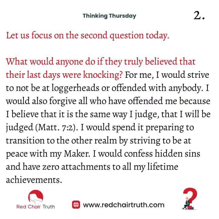 What would anyone do if they truly believed that their last days were knocking? For me, I would strive to not be at loggerheads or offended with anybody. I would also forgive all who have offended me because I believe that it is the same way I judge, that I will be judged (Matt. 7:2). I would spend it preparing to transition to the other realm by striving to be at peace with my Maker. I would confess hidden sins and have zero attachments to all my lifetime achievements.