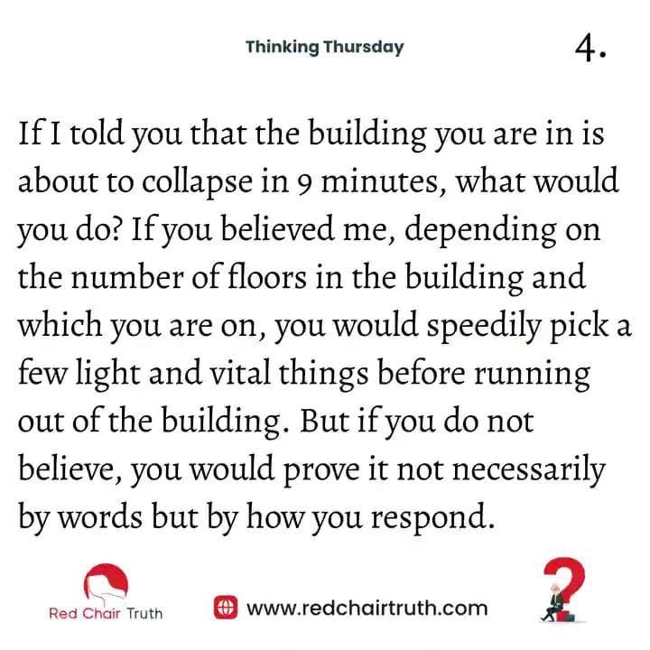 If I told you that the building you are in is about to collapse in 9 minutes, what would you do? If you believed me, depending on the number of floors in the building and which you are on, you would speedily pick a few light and vital things before running out of the building. But if you do not believe, you would prove it not necessarily by words but by how you respond.