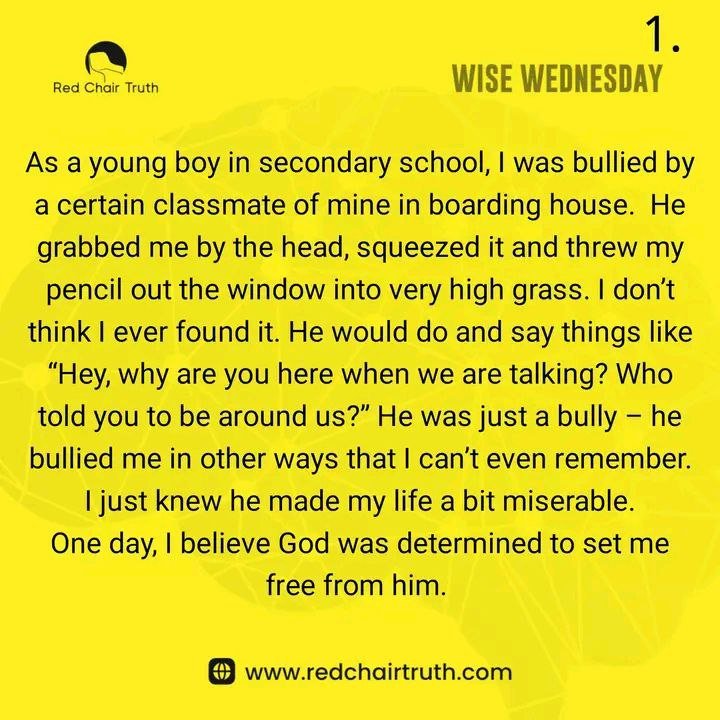 As a young boy in secondary school, I was bullied by a certain classmate of mine in the boarding house. He grabbed me by the head, squeezed it, and threw my pencil out the window into very high grass. I don’t think I ever found it. He would do and say things like “Hey, why are you here when we are talking? Who told you to be around us?” He was just a bully – he bullied me in other ways that I can’t even remember. I just knew he made my life a bit miserable.