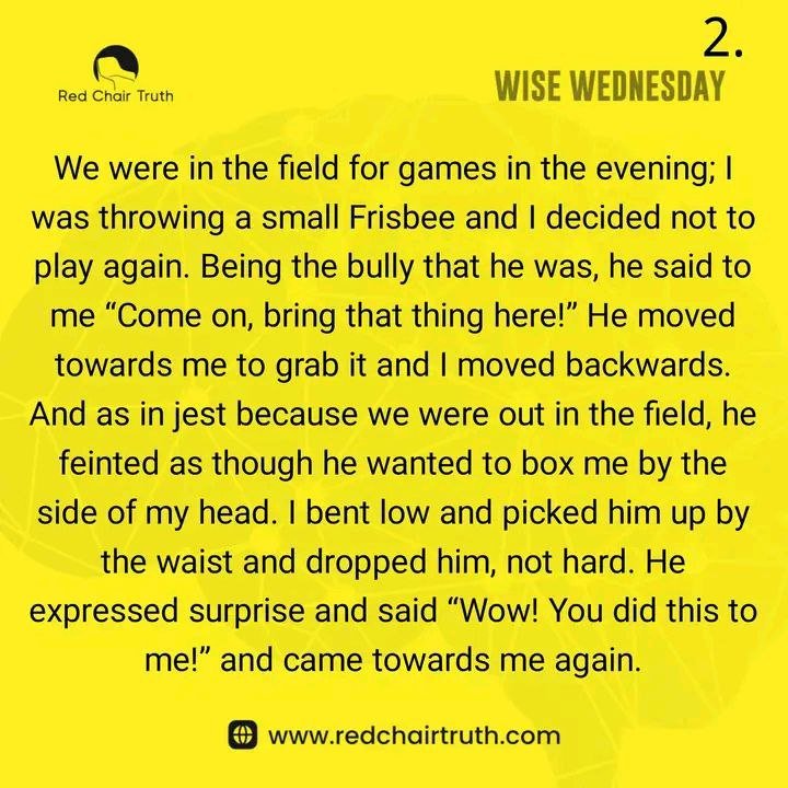 One day, I believe God was determined to set me free from him. We were in the field for games in the evening; I was throwing a small Frisbee, and I decided not to play again. Being the bully that he was, he said to me, “Come on, bring that thing here!” He moved towards me to grab it, and I moved backward. And as in jest, because we were out in the field, he feinted as though he wanted to box me by the side of my head. I bent low and picked him up by the waist and dropped him, not hard. He expressed surprise and said, “Wow! You did this to me!” and came towards me again.