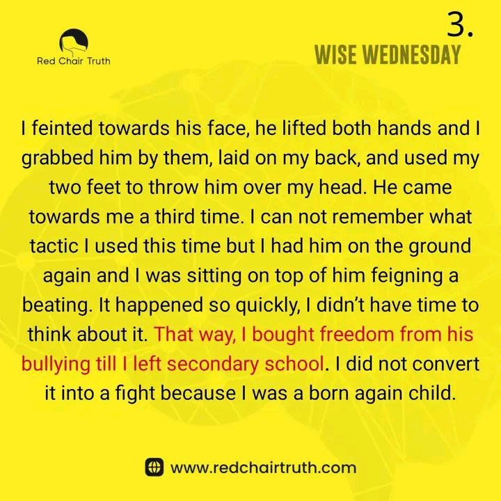 I feinted towards his face, he lifted both hands, and I grabbed him by them, lay on my back, and used my two feet to throw him over my head. He came towards me a third time. I can not remember what tactic I used this time, but I had him on the ground again, and I was sitting on top of him, feigning a beating. It happened so quickly, I didn’t have time to think about it. That way, I bought freedom from his bullying till I left secondary school. I did not convert it into a fight because I was a born-again child.
