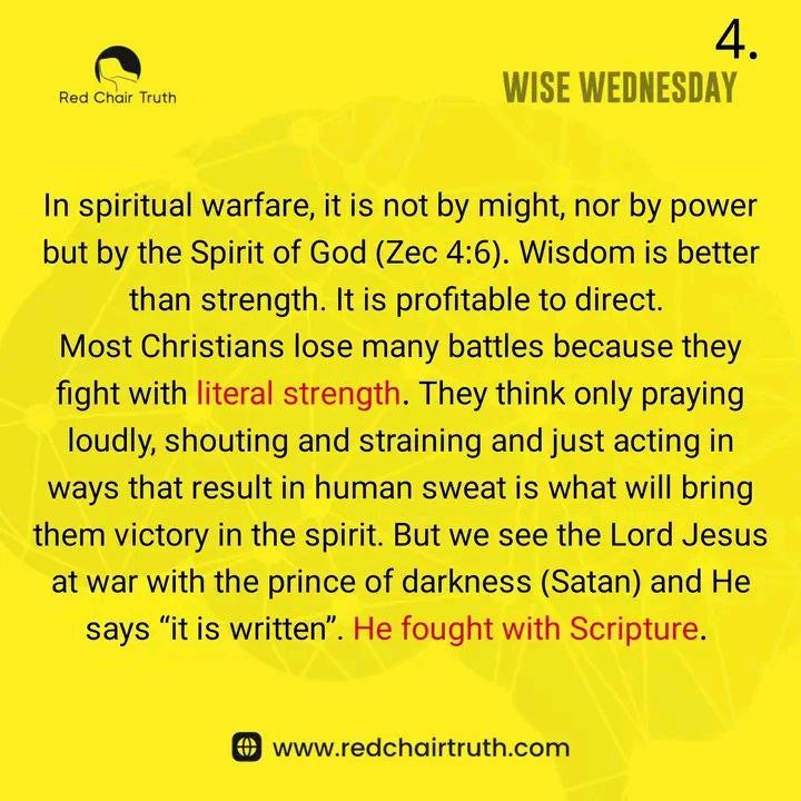 In spiritual warfare, it is not by might, nor by power, but by the Spirit of God (Zec 4:6). Wisdom is better than strength. It is profitable to direct. Most Christians lose many battles because they fight with literal strength. They think that only praying loudly, shouting and straining, and just acting in ways that result in human sweat is what will bring them victory in the spirit. But we see the Lord Jesus at war with the prince of darkness (Satan), and He says, “It is written”. He fought with Scripture.