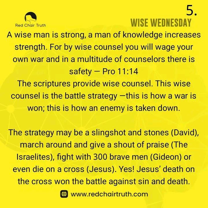 The scriptures provide wise counsel. This wise counsel is the battle strategy – this is how a war is won; this is how an enemy is taken down. The strategy may be a slingshot and stones (David), march around and give a shout of praise (The Israelites), fight with 300 brave men (Gideon), or even die on a cross (Jesus). Yes! Jesus’ death on the cross won the battle against sin and death