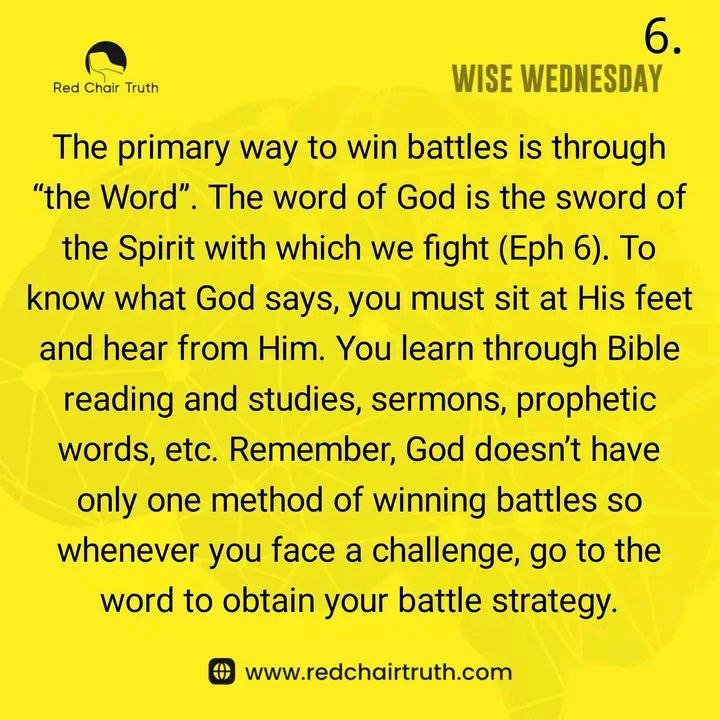 The primary way to win battles is through “the Word”. The word of God is the sword of the Spirit with which we fight (Eph 6). To know what God says, you must sit at His feet and hear from Him. You learn through Bible reading and studies, sermons, prophetic words, etc. Remember, God doesn’t have only one method of winning battles, so whenever you face a challenge, go to the Word to obtain your battle strategy.