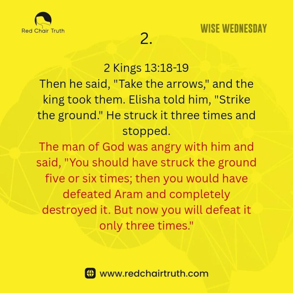 The man of God was angry with him and said, “You should have struck the ground five or six times; then you would have defeated Aram and completely destroyed it. But now you will defeat it only three times.”