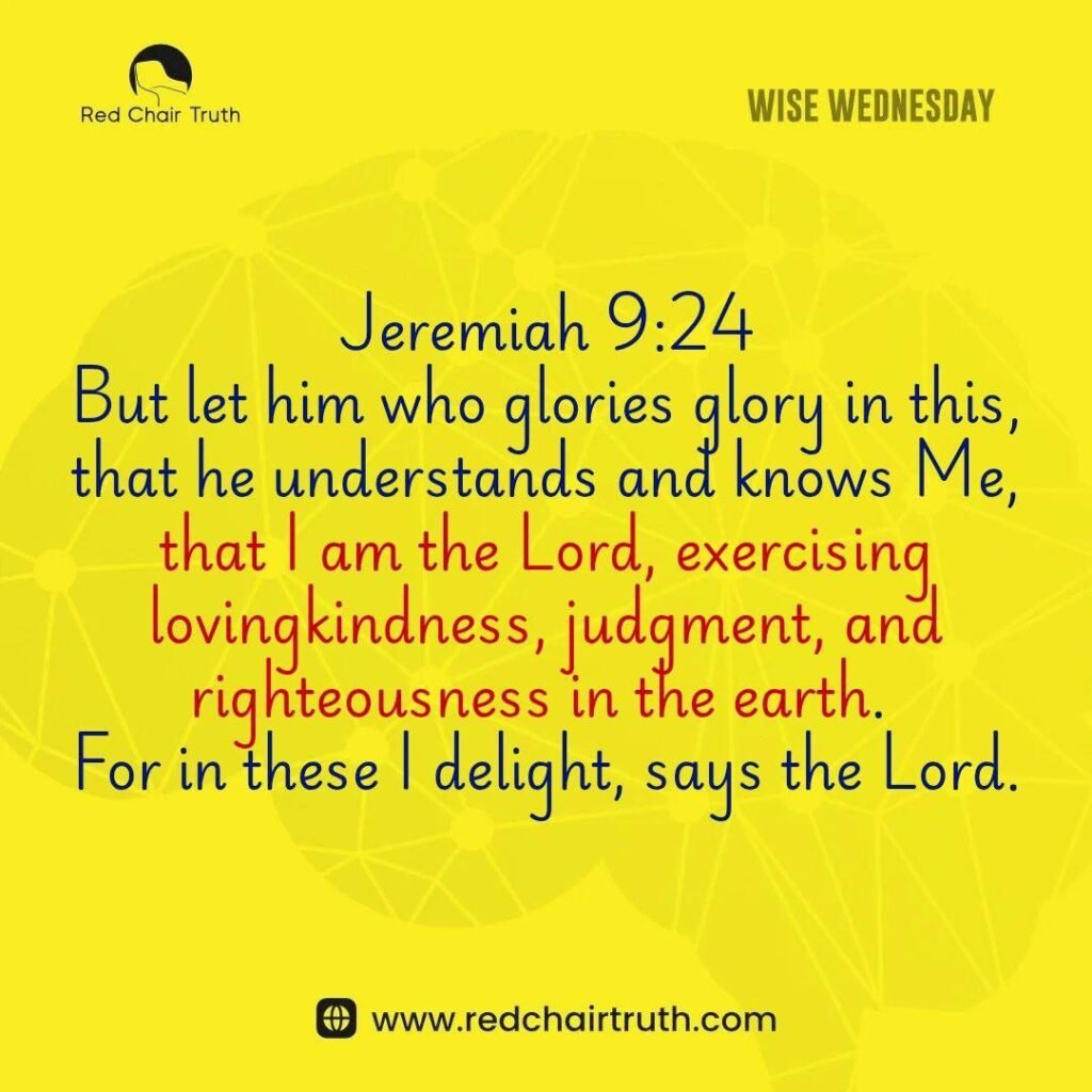 But let him who glories glory in this, that he understands and knows Me, that I am the Lord, exercising, lovingkindness, judgment, and righteousness in the earth. For in these I delight, says the Lord.