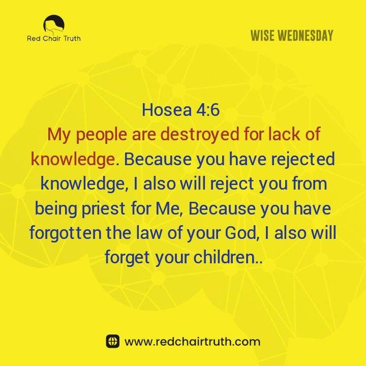My people are destroyed for lack of knowledge. Because you have rejected knowledge, I also will reject you from being priest for Me, Because you have forgotten the law of your God, I also will forget your children.