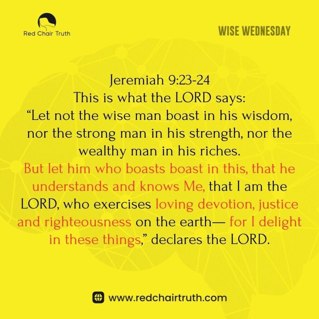 But let him who boasts boast in this, that he understands and knows Me, that I am the LORD, who exercises loving devotion, justice and righteousness on the earth- for I delight in these things,” declares the LORD.