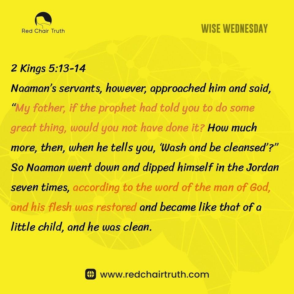 Naaman’s servants, however, approached him and said, “My father, if the prophet had told you to do some great thing, would you not have done it? How much more, then, when he tells you, ‘Wash and be cleansed’?” So Naaman went down and dipped himself in the Jordan seven times, according to the word of the man of God, and his flesh was restored and became like that of a little child, and he was clean.