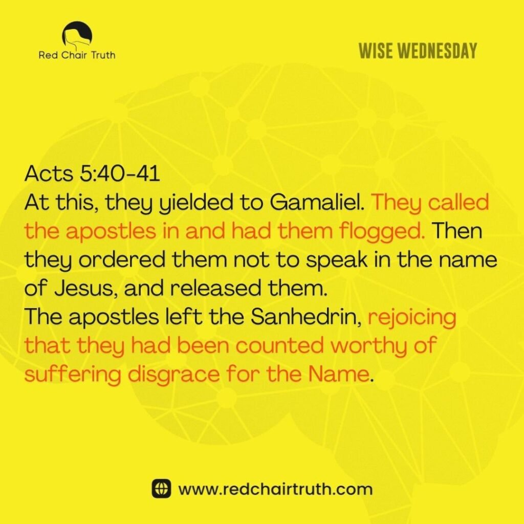 At this, they yielded to Gamaliel. They called the apostles in and had them flogged. Then they ordered them not to speak in the name of Jesus, and released them. The apostles left the Sanhedrin, rejoicing that they had been counted worthy of suffering disgrace for the Name.