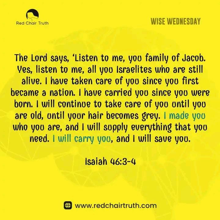 The Lord says, ‘Listen to me, you family of Jacob. Ves, listen to me, all you Israelites who are still alive. I have taken care of you since you first became a nation. I have carried you since you were born. I will continue to take care of you until you are old, until your hair becomes grey. I made you who you are, and I will supply everything that you need. I will carry you, and I will save you.